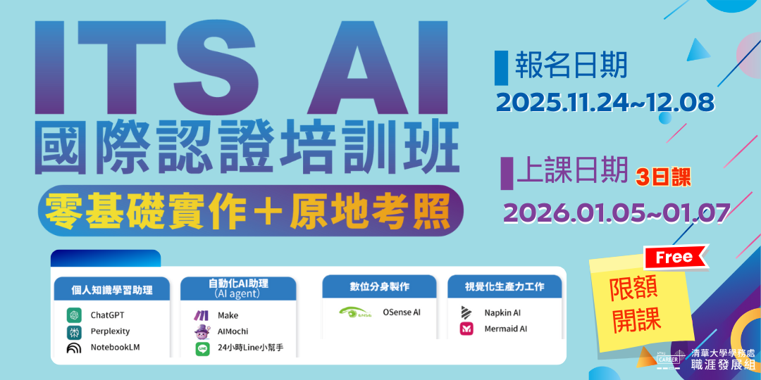 清華大學職涯發展組為了提升學生在職場上的競爭力,特別規劃了職涯數位能力課程,旨在幫助學生培養未來的就業技能。隨著 AI 人工智慧成為最熱門的新興科技,其核心能力在職場上越來越受到重視。本課程設計完全對應 ITS AI 的考科範圍,深入分析並安排所有流程,透過密集訓練與系統化學習,即使是初學者也能在短時間內掌握關鍵知識,順利通過認證考試。即便是無基礎的學生從零開始也可培養應用能力,幫助學生與產業接軌。課程中將包含廣泛應用 AI 工具的實做練習,指導學生在學習技能後產出符合企業需求的作品,進一步提升其專業能力和面試競爭力。