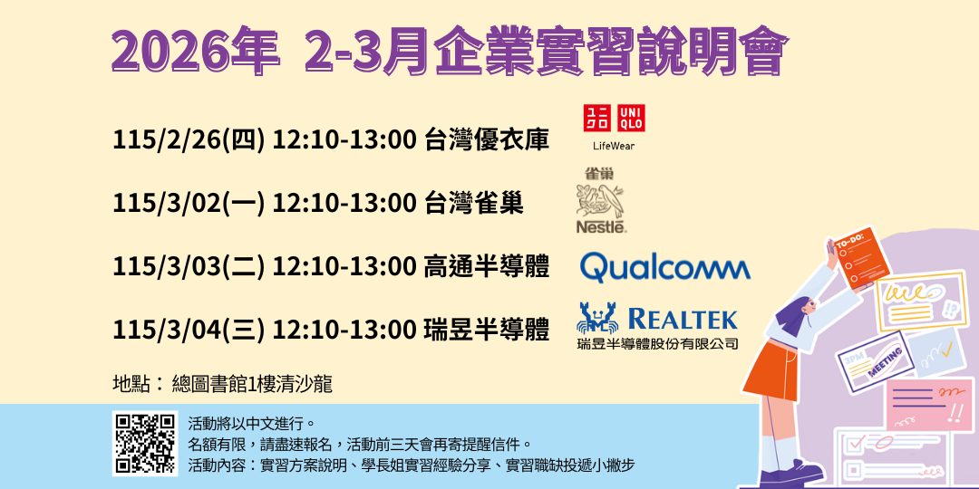 為使同學更了解不同企業的實習計畫,職涯發展組於2/26(四)、3/02(一)、3/03(二)、3/04(三)中午辦理辦理企業實習說明會。