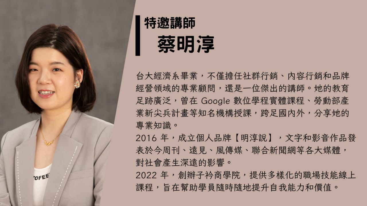 是不是有點心動呢?是不是開始好奇蔡明淳講師當天會如何分享她在經營個人品牌中遭遇的種種挑戰和心境轉變?😉