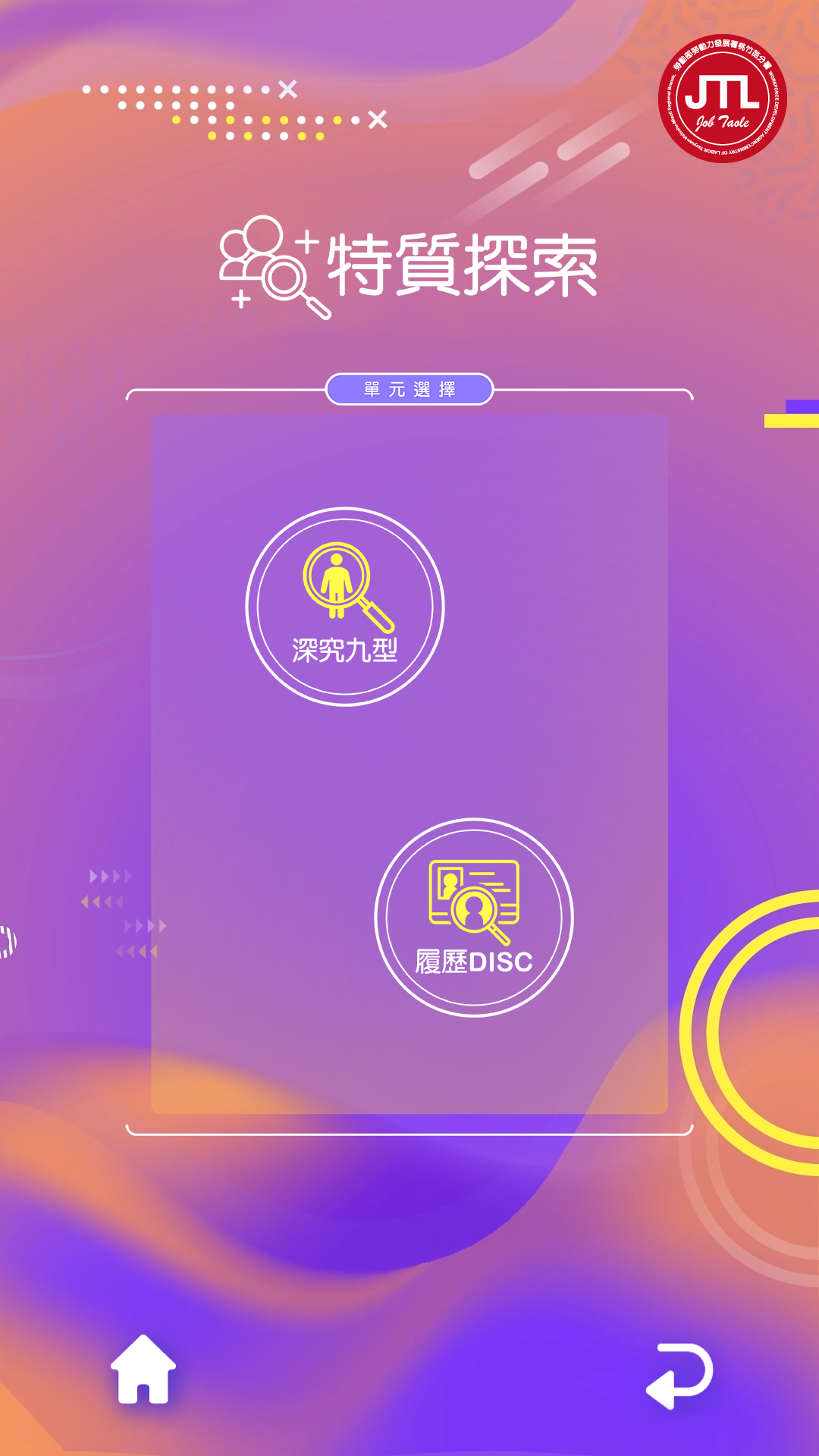 九型人格 透過 108 道情境題切入,找出人格類型與適合的職務方向;履歷DISC著重工作中的行為模式,幫助理解自己的溝通風格與職場角色。
